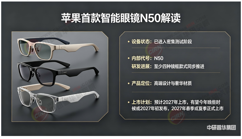据业内人士透露,苹果首款智能眼镜已进入密集测试阶段,该设备内部代号为N50,至少四种镜框款式同步推进研发,主打高端设计与奢华材质。关于上市时间,该人士表示,该款智能眼镜预计在2027年上市,有望在今年晚些时候或2027年初发布,并于2027年春季或夏季正式上市。