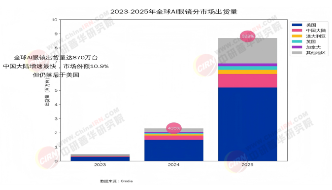 据权威数据显示,全球AI眼镜的出货规模在2025年达到870万副,增幅232%。中国大陆是增长最快的市场,年度总出货量近100万副,市场份额占比10.9%,仅次于美国。