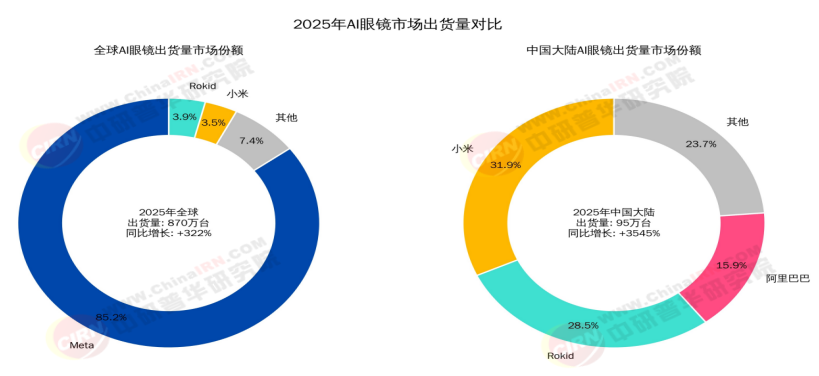 图表:2025年全球及中国AI眼镜市场出货量对比