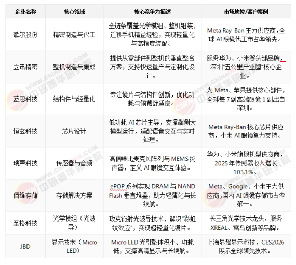 图表:我国AI眼镜产业链中重点龙头企业的核心竞争力