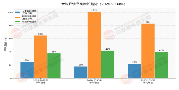 从智能眼镜整体市场看,智能眼镜总量保持38%-42%的高复合增速,行业长期确定性强。AI眼镜增长稳健,前期(2025-2027)增速 25%,后期(2028-2030)放缓至18%,复合增速22%,是当前主流放量品类。