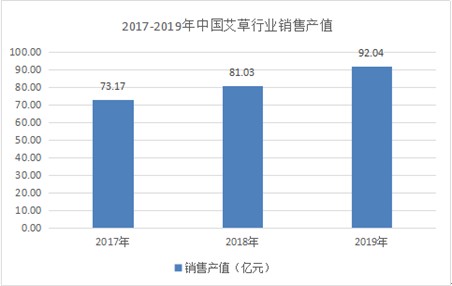 据数据显示,2017年中国艾草行业销售产值为73.17亿元,2018年中国艾草行业销售产值为81.03亿元,2019年中国艾草行业销售产值为92.04亿元,同比增速为13.59%。