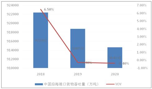港口货物吞吐量是港口物流能力的最基本的体现,沿海港口货物吞吐量需求不断增长的原动力来自于改革开放后充满活力的国民经济和国际贸易的快速发展,港口在国际航运市场上的竞争力逐步增强,在货物吞吐量和集装箱吞吐量方面领先世界,2020年我国沿海港口完成货物吞吐量91.4亿吨,其中货物出口量为41.8亿吨,货物进港量为49.6亿吨。