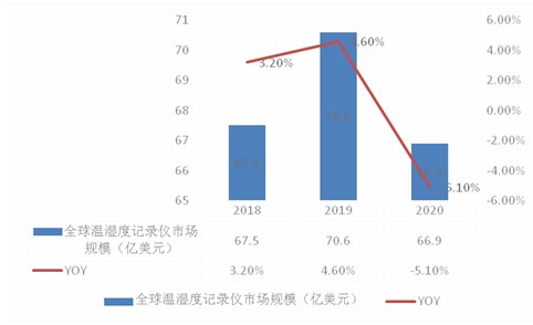新兴市场增量市场动能带动下,全球温湿度记录仪市场规模从67.5亿美元增长至70.6亿美元,温湿度记录仪增长幅度达到4.6%,2020年全球受新冠疫情影响,全球温湿度记录仪产业受生产停滞以及下游需求萎缩影响,温湿度记录仪市场规模萎缩至66.9亿美元,2020年温湿度记录仪较2019年回落5.1%。