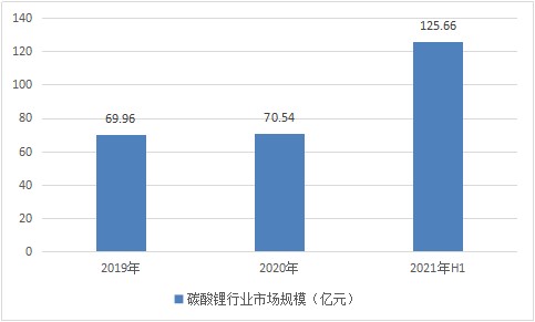 图表:2019-2021年H1碳酸锂行业市场规模(亿元)