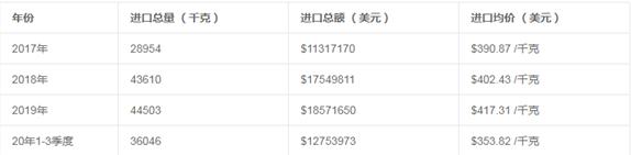 图表:2017-2020年前三季度中国其他非工业用镍制品产品进口总额情况