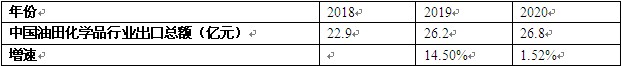 从海关统计数据显示,2020年国内出口油田化学品产品累计总额达26.8亿元,同比上年增长1.52%,主要出口向美国和东南亚国家。
