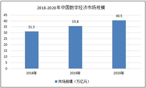据数据显示,2018年中国数字经济市场规模为31.3万亿元,2019年中国数字经济市场规模为35.8万亿元,2020年中国数字经济市场规模为40.5万亿元同比增速13.16%。