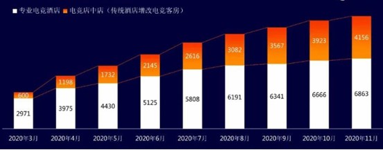 从数据来看,2020年3-11月,全国电竞酒店数量直线破万,总额呈明显的上升之势,平均月增速约为130%,行业规模持续扩大。值得关注的是,随着电子竞技热度持续上升、疫情影响下消费升级的市场需求、多电竞扶持政策的相应出台,国内电竞酒店的数量爆发增加,逐步成为传统酒店及网吧转型升级的主要方向。