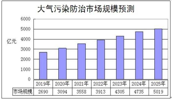 近十年来,大气污染治理市场需求持续释放,行业获得蓬勃发展。根据不完全统计,2019年,我国大气污染治理规模约为2600-2800亿元。未来五年,大气污染治理仍是我国环保重点的攻坚方向。2021-2025年市场规模超过3300亿元。