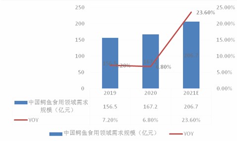 2019-2021年我国鳄鱼食用领域需求规模持续增长,预计到2021年年底我国鳄鱼食用领域需求规模有望达到206.7亿元。