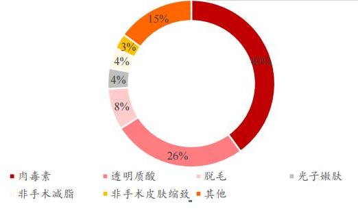 目前生物注射材料端仍以玻尿酸、肉毒素为主。中研普华研究院预测肉毒素、玻尿酸还会继续唱主角,胶原蛋白等短期来看仍只是玻尿酸的一个补充。报告显示,玻尿酸、肉毒素占据填充市场的85%以上。