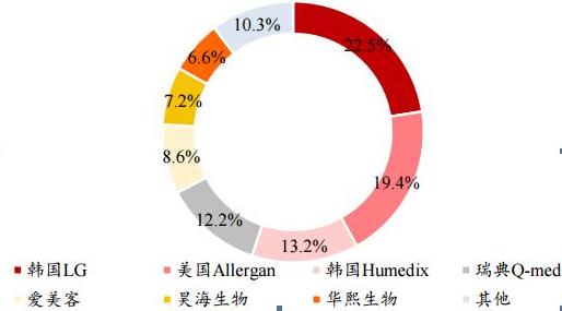 当前玻尿酸市场仍是艾尔建、韩国LG等旗下产品位居前列,国产玻尿酸产品则以爱美客、华熙生物以及昊海生科旗下产品占据较大市场份额。肉毒素领域目前国内仅四张注册证,分别是国产衡力、艾尔建旗下保妥适(Botox)以及高德美吉适(Dysport)以及四环医药代理的由韩国Hugel生产的肉毒素乐提葆(Letybo)。