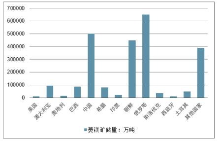 前全球的菱镁矿储量达240亿吨,菱镁矿资源多分布于中国、朝鲜、俄罗斯等地,其中,中国的菱镁矿储量为50亿吨,位居全球第二位。