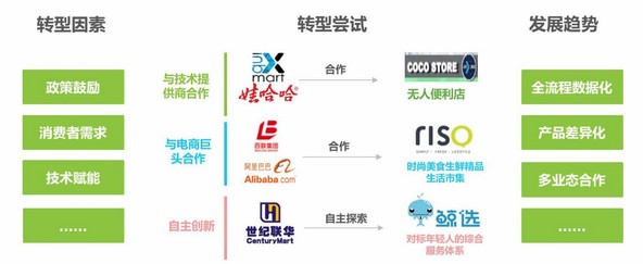 面对中国经济结构的调整加快,消费者诉求在电子商务、移动支付的普及以及智能技术发展的推动下,传统零售企业也在不断尝试着转型升级,主要包括三种转型模式:1)与技术提供商合作开发,如哇哈哈快猫合作的无人便利店;2)与电商巨头合作创建新型零售生态,如百联集团与阿里巴巴合作的针对中高等收入人群的精选超市;3)自主创新探索新增长点,如世纪联华的对标年轻人综合消费的鲸选APP。艾瑞咨询认为,传统零售全流程数据化、产品差异化、多业态合作等将会成为新的竞争要素。