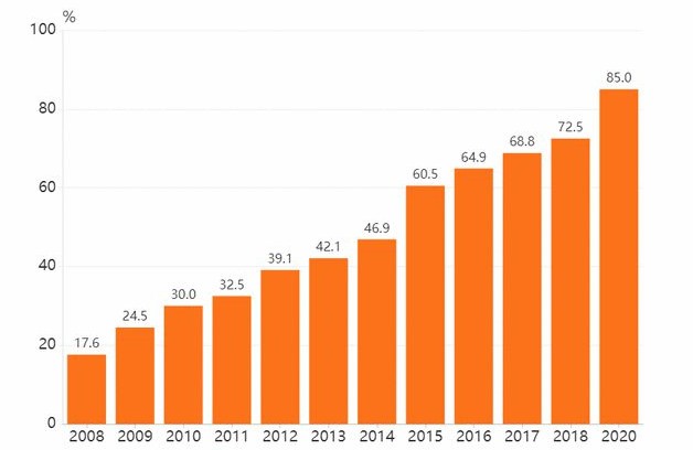图表:2008-2020年中国移动支付普及率(单位:%)