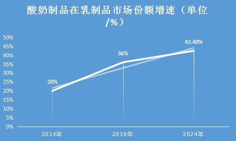 据Euromonitor的数据,我国酸奶制品销售额将从2012年的456亿元增长至2022年的2200亿元,年复合增长率9.2%。该数据显示,酸奶市场的增速从2014年的25.4%一直走低。但酸奶在整个乳品市场中的占比从2014年的20%跃升到2019年的36%,预计到 2024 年将进一步提升至 42.2%。