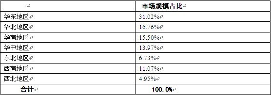 家纺是所有家庭所必需的日用品,整个行业的发展较稳定。其地区分布和各地区家庭数量、家庭的消费能力有较大关联。2019年,中国七大地区中,华东地区市场规模占比最重,约为31.02%,其次是华北和华南,分别占16.76%和15.50%。