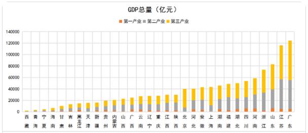分省份看,广东2021年GDP首次超过12万亿元,达124369.67亿元,连续33年居全国首位;江苏(116364.2亿元)首次突破11万亿元大关,位列第二位;山东(83095.9亿元)排名第三。西藏垫底,GDP总量为2080.17亿元。