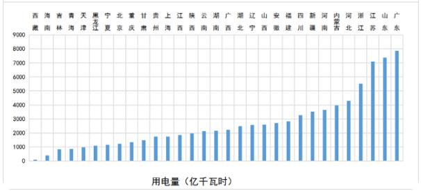从用电量看,有3个省份用电量在7000亿千瓦时以上。广东以7867亿千瓦时的用电量居于榜首;山东第二,用电量为7383亿千瓦时;江苏(7101亿千瓦时)第三;西藏垫底,累计用电量101亿千瓦时。