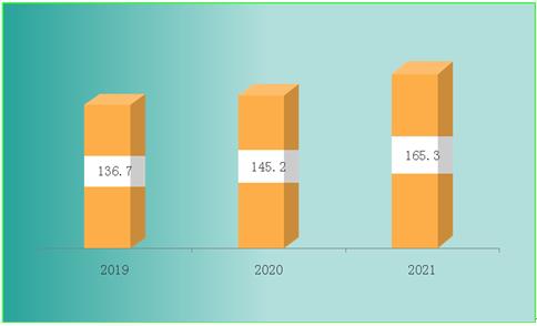 图表:2019-2021年我国电源管理芯片销售产值(亿元)