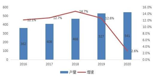 图表:2016-2020年中国玻璃纤维市场供给及增速情况(万吨)