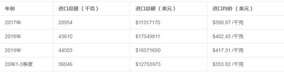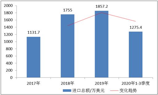 图表:2017-2020年前三季度中国其他非工业用镍制品产品进口总额情况