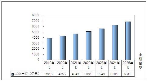 图表:2019-2025年中国氢能源行业工业产值预测