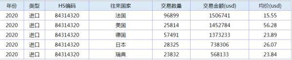 根据相关数据,我国锚杆及其他钻探机用零件的进口来源国主要有:德国、美国、日本、瑞典、加拿大、法国等国,不同年份不同国家的进口金额有些许不同。以下是2020年我国相关产品的进口来源国数据,2020年我国从法国进口锚杆等产品数量最多,达到96899kg,交易金额超过150万美元,从美国、德国、日本及瑞典等国的进口额次之。
