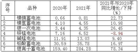 2021年中国主要电池品种出口额为349.31亿美元,2020年出口额为217.26亿美元,同比上涨60.78%。其中,锂离子蓄电池出口额占81.38%,铅酸蓄电池出口额占10.24%,锌锰/碱锰电池出口额占5.60%,镍氢蓄电池出口额占1.30%,镍镉蓄电池出口额占0.23%。