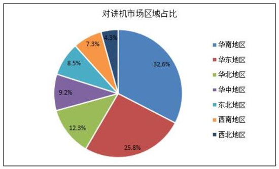 数据显示,对讲机区域占比中,华南地区占比32.6%,华东地区占比25.8%,华北地区占比12.3%,华中地区占比9.2%,东北地区占比8.5%,西南地区占比7.3%,西北地区占比4.3%。
