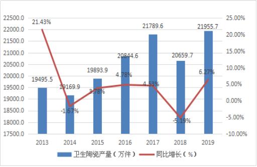 图表:2013-2019年我国卫生陶瓷产量及增速