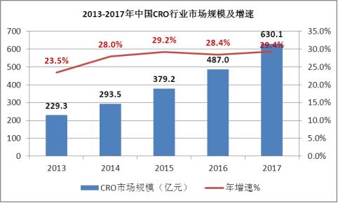 图表:2013-2017年中国CRO行业市场规模及增速