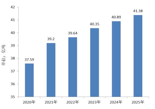 2019年,中国煤炭开采量达到38.46亿吨,预计到2025年底,中国煤炭开采两江达到41.38亿吨。