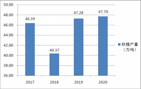 图表:2017-2020年我国软糖产量(单位:万吨)