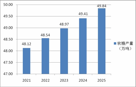 我国糖果行业产量近几年虽然呈现波动趋势,尤其是在2018年出现了较大幅度变化,但总体来说,还是呈现小幅度上升趋势。2017-2020年,软糖产量年复合增长率约为0.93%。预计未来几年,随着软糖产品需求量的上升和生产技术的更新成熟,产量将会继续增长,到2025年产量将突破49.84万吨。
