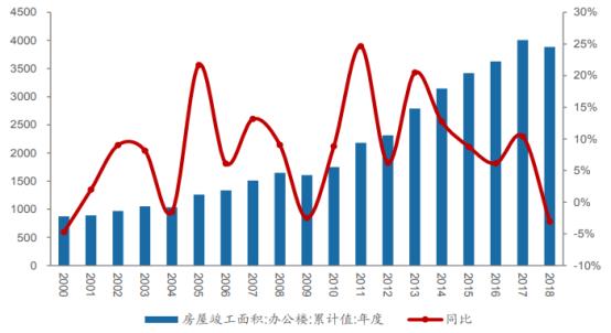 截至2019年,国内办公楼竣工面积3923万平方米,同比增长1%,2013-2019年中国办公楼竣工面积复合增长率5.85%。