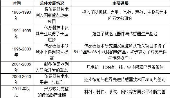 我国传感器行业发展始于20世纪50年代,但直到1986年“七五”开始进入到实质发展阶段,主要发展历程如下表