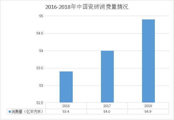 2018年,中国瓷砖消费量约为54.9亿平方米,较2017年上涨了1.67%。行业近几年消费量增长缓慢,市场成熟度较高。