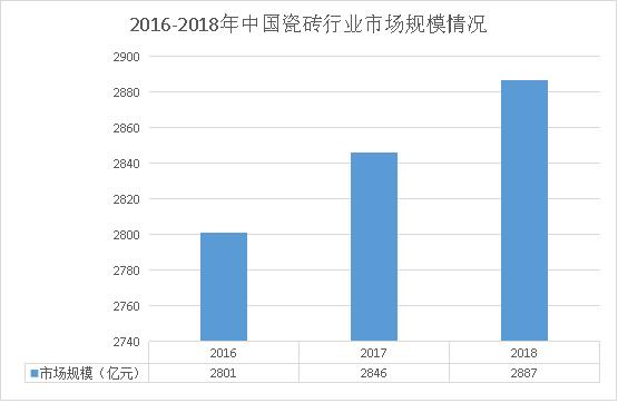 2018年,中国瓷砖行业市场规模约为2887亿元,较2017年上涨了1.44%。近年来,国内瓷砖行业产能过剩,行业较成熟,增速较慢。