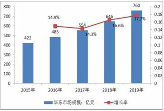 2019年华东地区市场规模为760亿元,同比增长大约17.7%。2018年华东地区市场规模为646亿元。