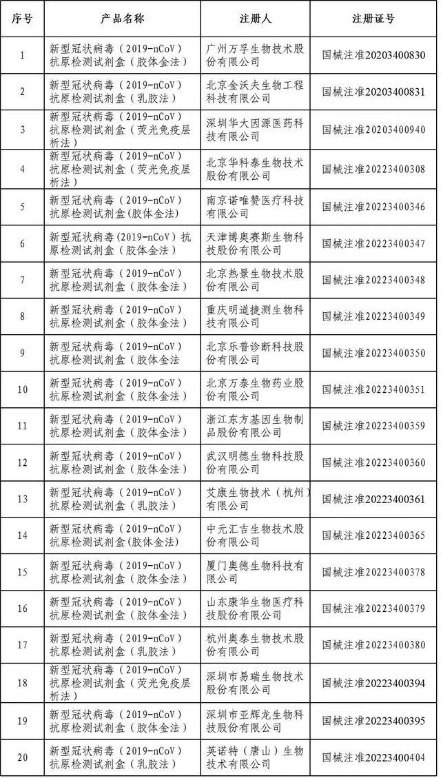3月29日,国家药监局经审查,再批准1个新冠病毒抗原检测试剂产品。截至29日,国家药监局已批准20个新冠病毒抗原检测试剂产品。