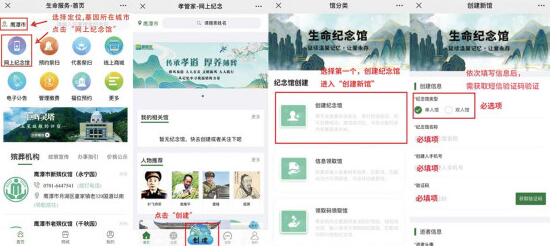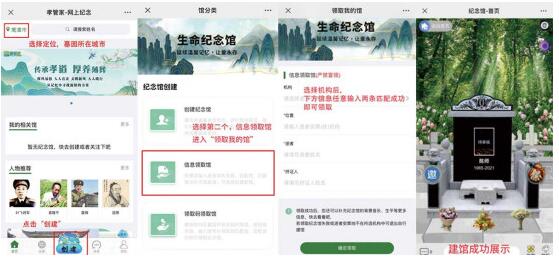 网上纪念馆免费建馆,在线祭祀。可自行建设去逝的亲友、英雄及伟人的网上纪念馆,通过文字、照片、视频等多种方式呈现生平简介、音容笑貌、荣誉、传记、悼文等。丧属可在所“孝管家”微信公众号下方菜单栏中“网上祭扫”进入“网上纪念馆”,将提供两种方式建馆: