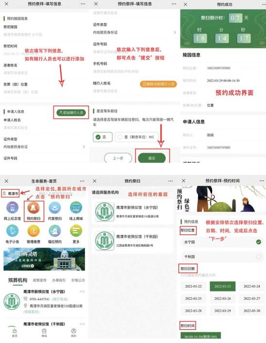 按照殡葬机构要求近期预约祭扫的人员要求、限定人员、时间、人数等。丧属提前在“孝管家”微信公众号“预约祭扫”中提前预约,根据逝去亲友所在地,选择对应墓、陵园即可通过平台通道快速完成预约。随后按照既定的预约流程安排家属有序入园祭扫。