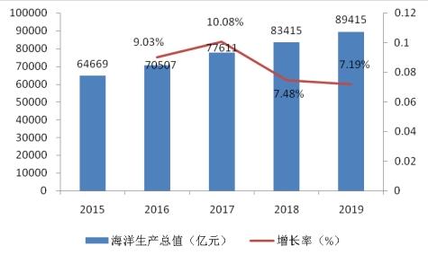 图表:2015—2019年全国海洋生产总值及增长率(单位:亿元)