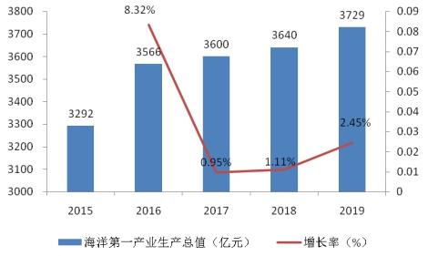 图表:2015—2019年全国海洋第一产业生产总值及增长率(单位:亿元)