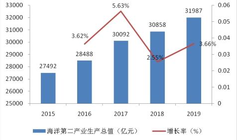 图表:2015—2019年全国海洋第二产业生产总值及增长率(单位:亿元)