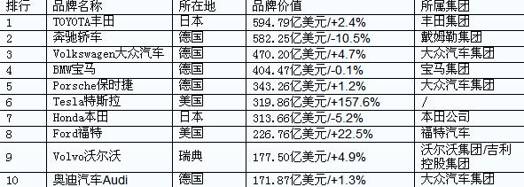 图表:全球最有价值的100个汽车品牌榜TOP10