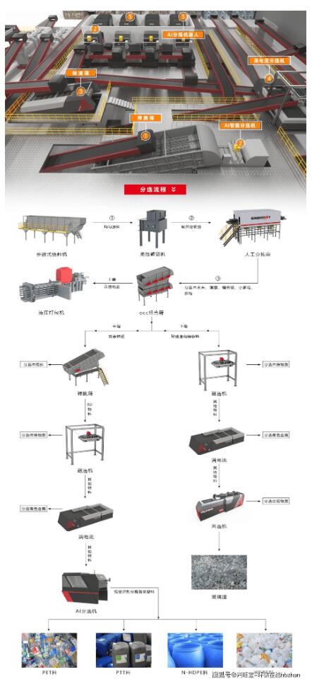由步进式给料机、柔性破袋机、OCC组合筛、AI智能分选机、弹跳筛、涡电流分选机、磁选机、风选机、2D/3D分选机、AI分拣机器人等强强组合的高智能化自动分拣流水线。