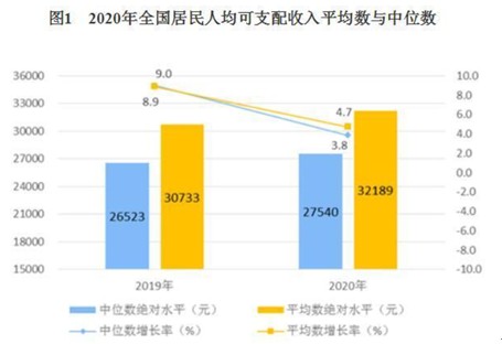 图表:2020年全国居民人均可支配收入平均数与中位数